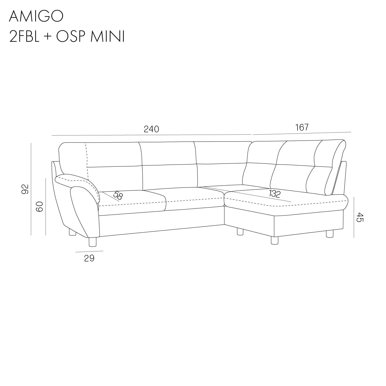 Meble mają wysokie, profilowane oparcia oraz duże metalowe nóżki, dodające im optycznej lekkości i przejrzystości. AMIGO jest godny polecenia jako miejsce odpoczynku dziennego i nocnego. Występuje w wersji prawo – i lewostronnej.
